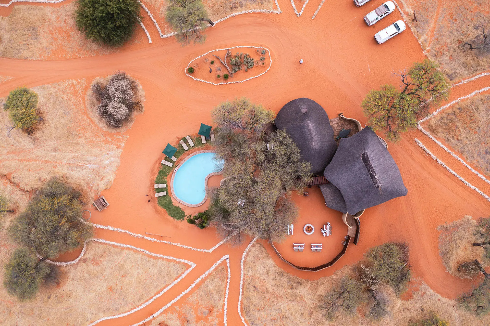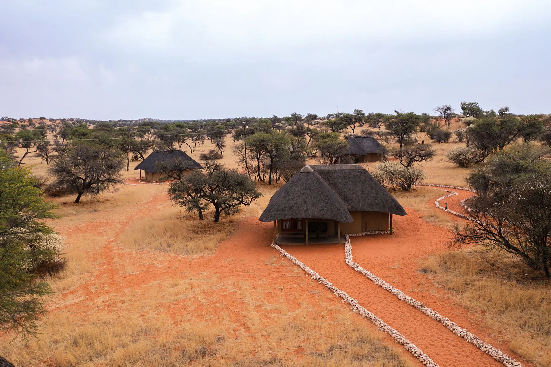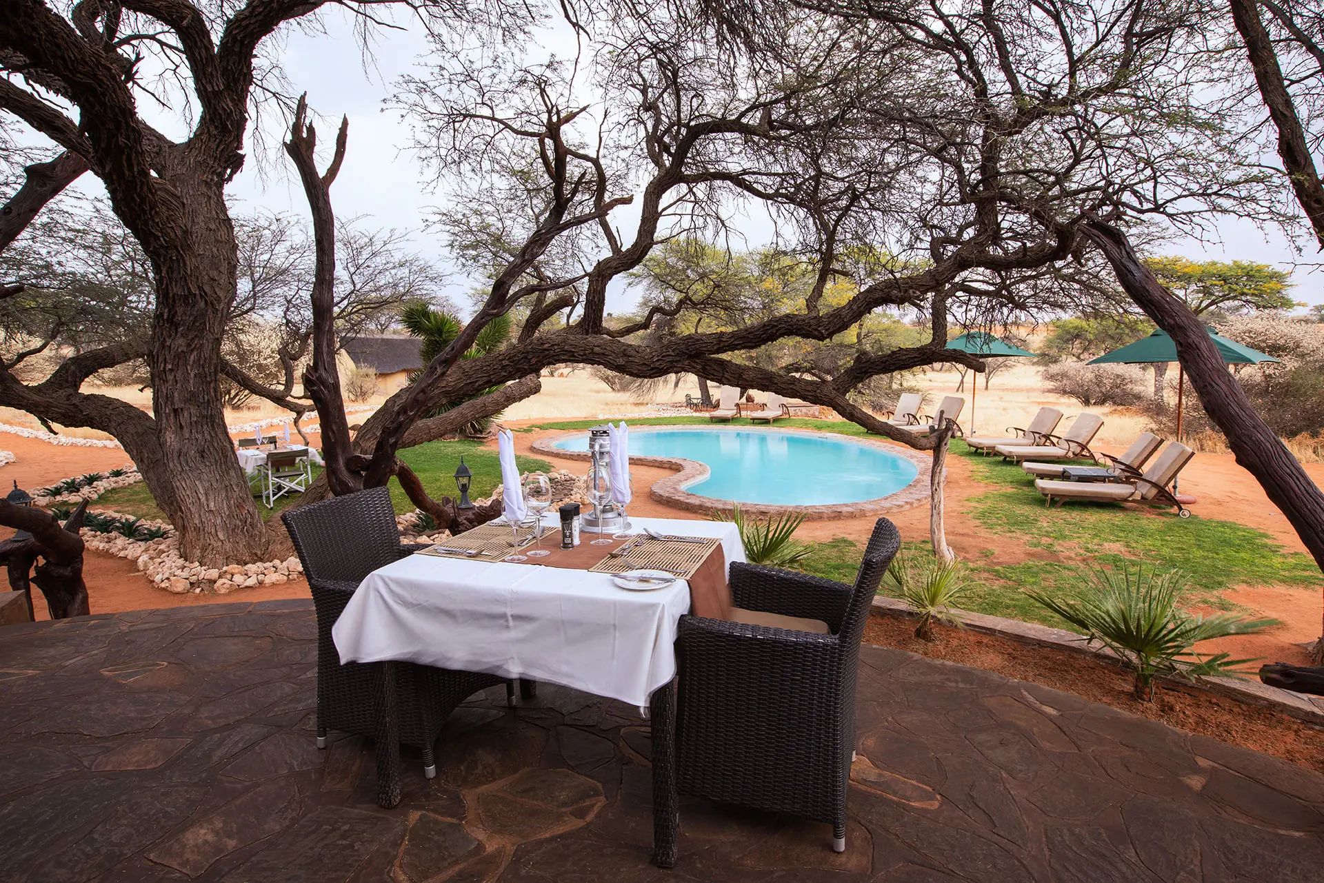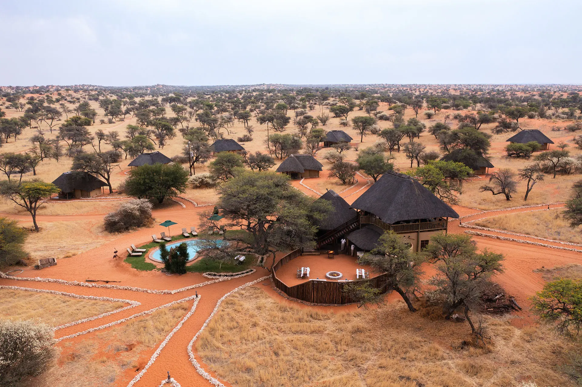 Tucked between two striking dunes and shaded by ancient Camelthorn and Acacia trees, Camelthorn Kalahari Lodge offers a truly intimate desert experience. Here, rustic charm meets modern comfort – the perfect blend of authenticity and relaxation