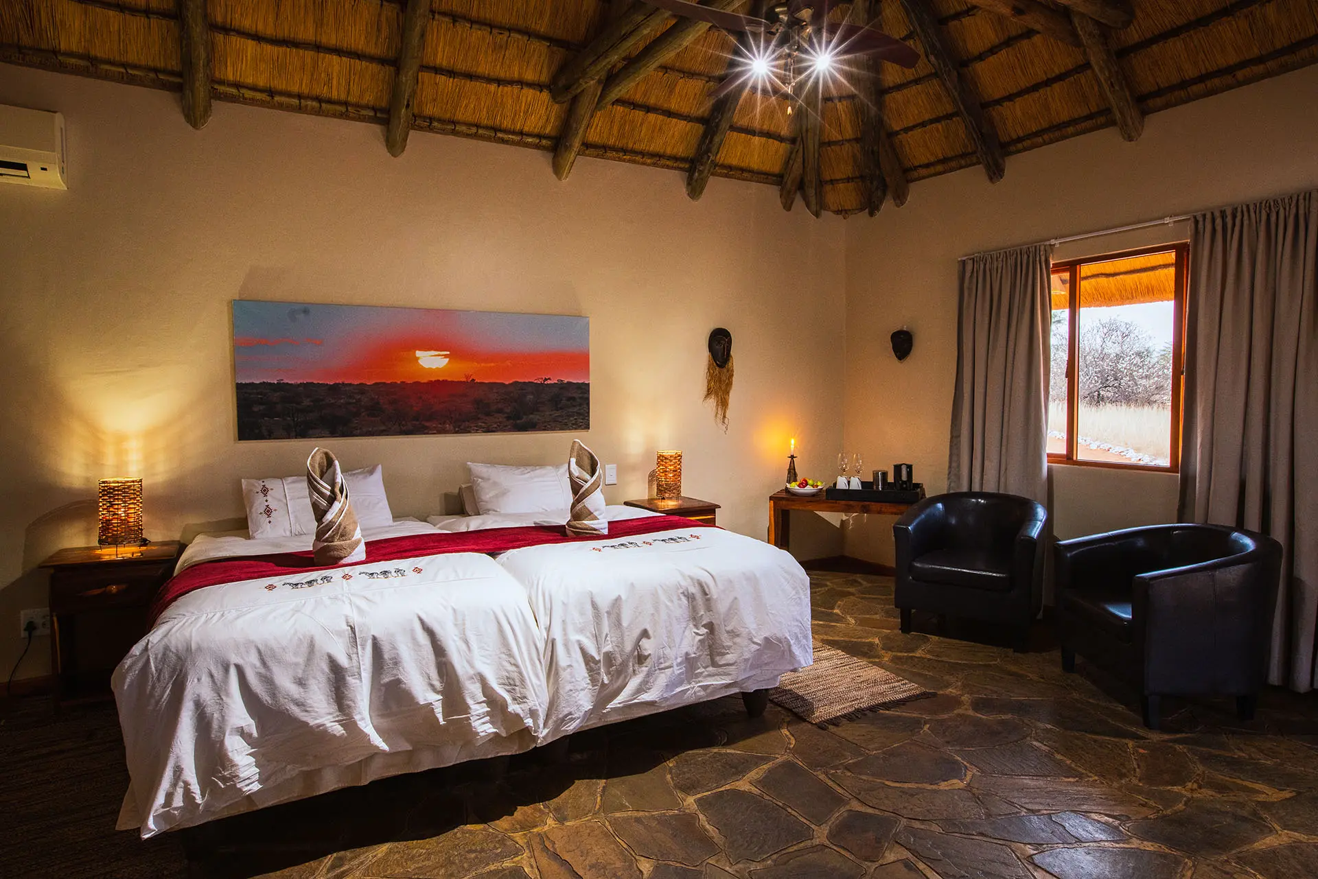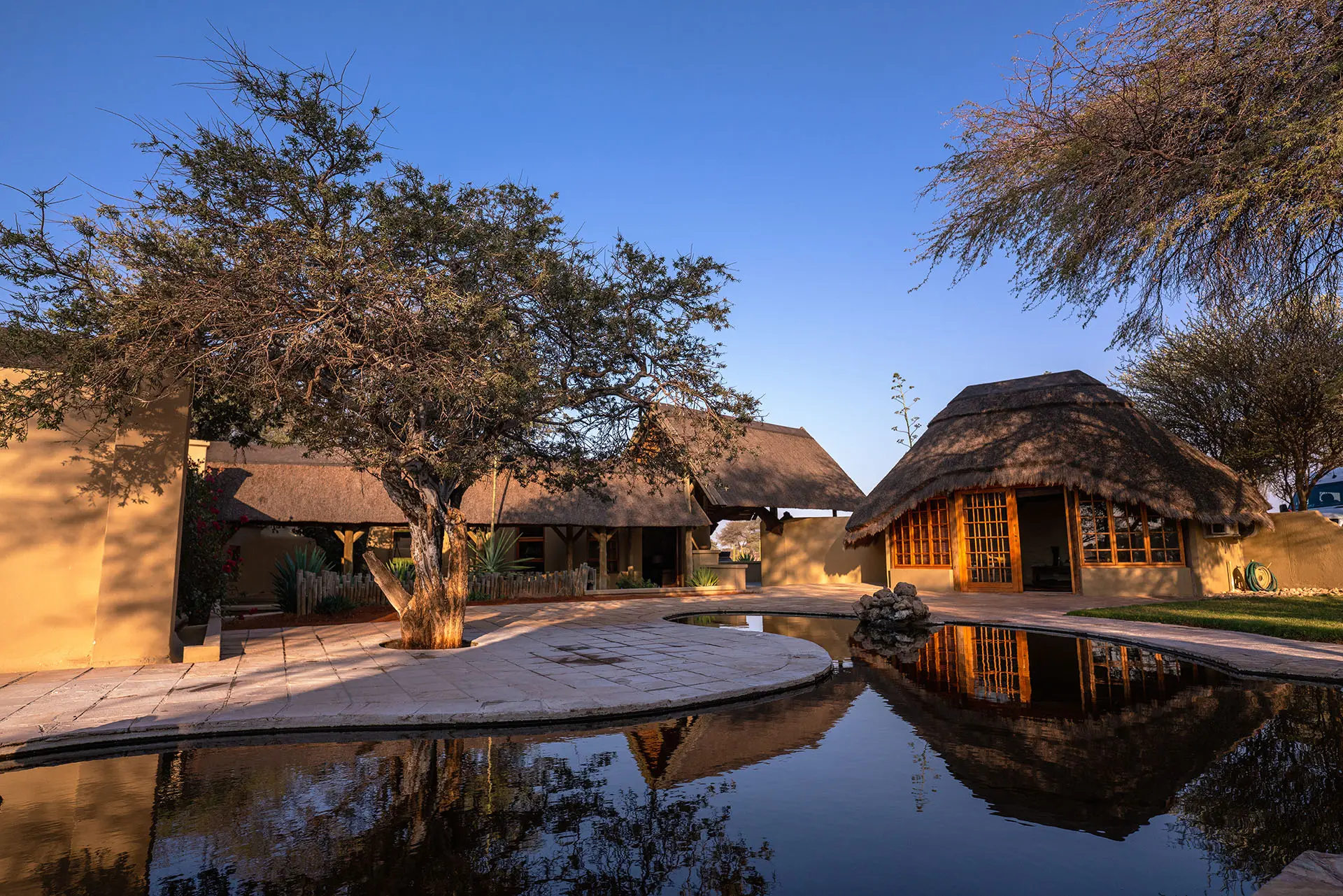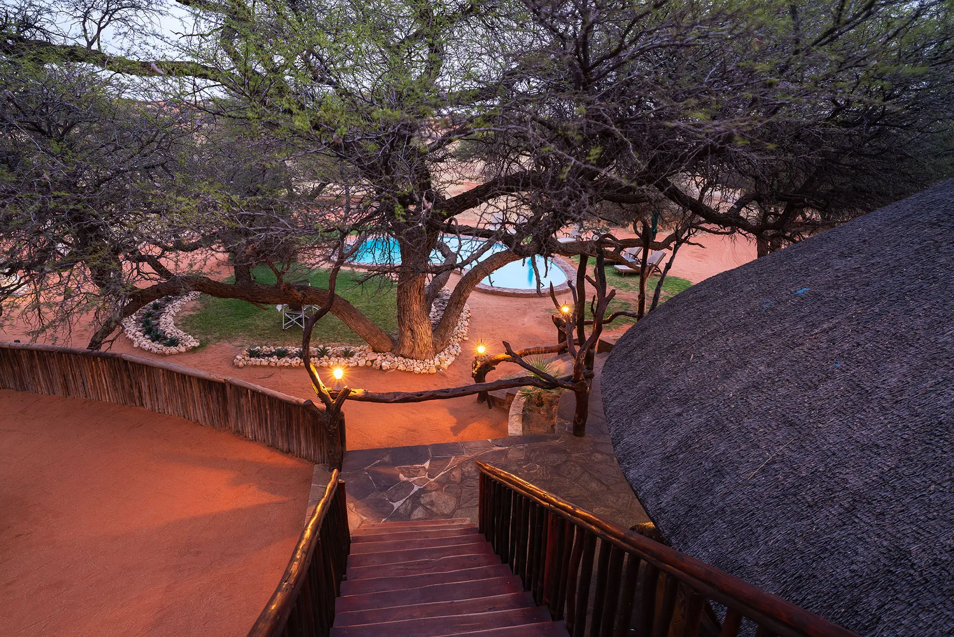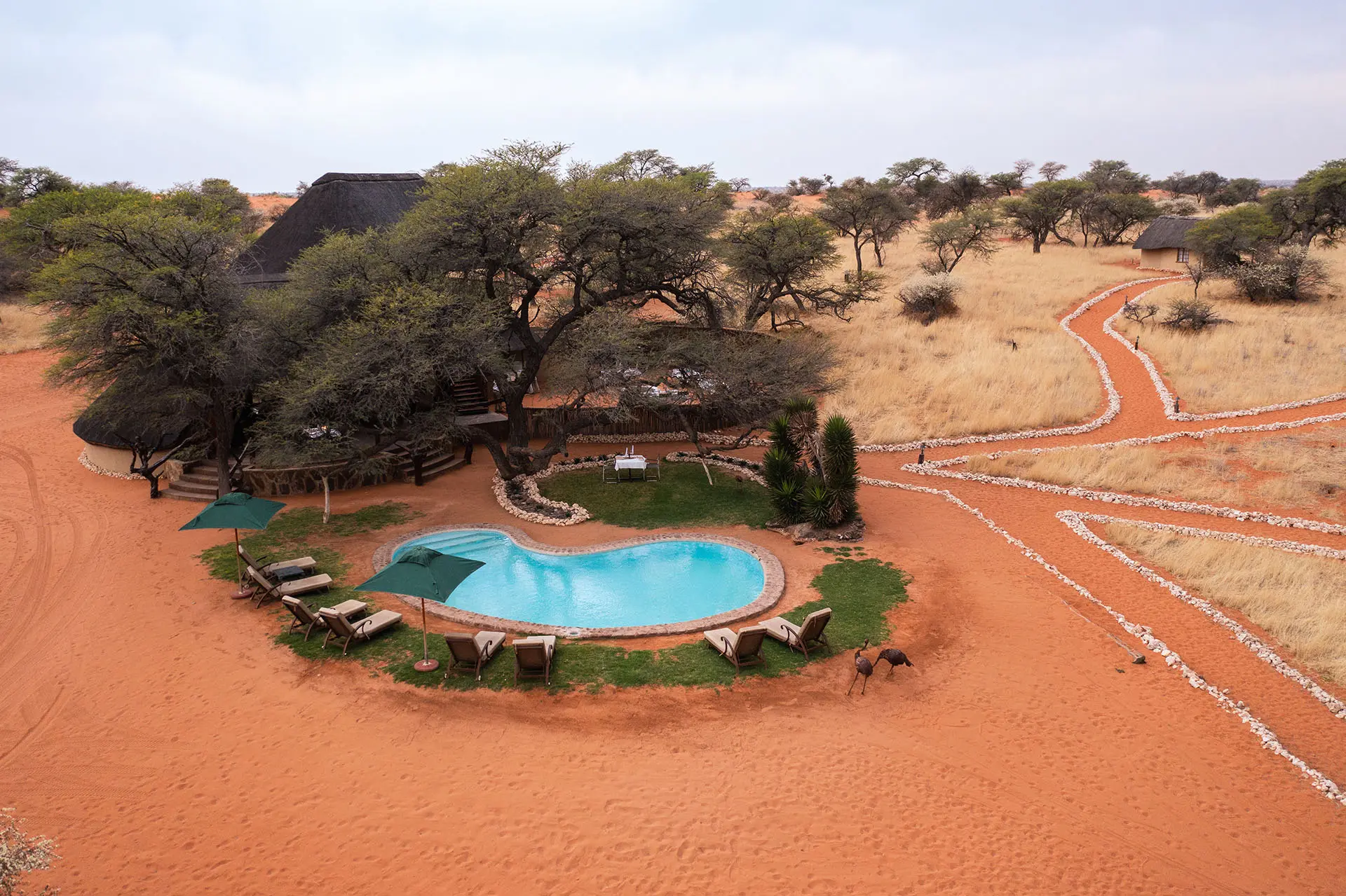 Tucked between two striking dunes and shaded by ancient Camelthorn and Acacia trees, Camelthorn Kalahari Lodge offers a truly intimate desert experience. Here, rustic charm meets modern comfort – the perfect blend of authenticity and relaxation