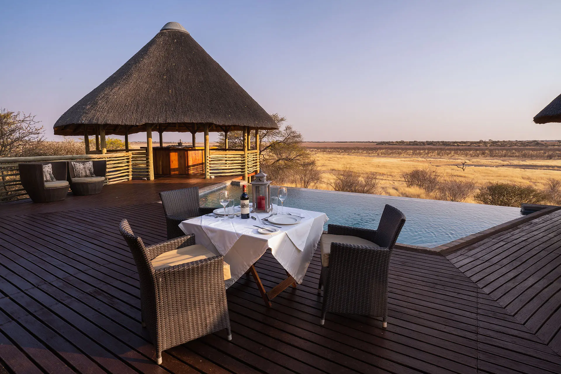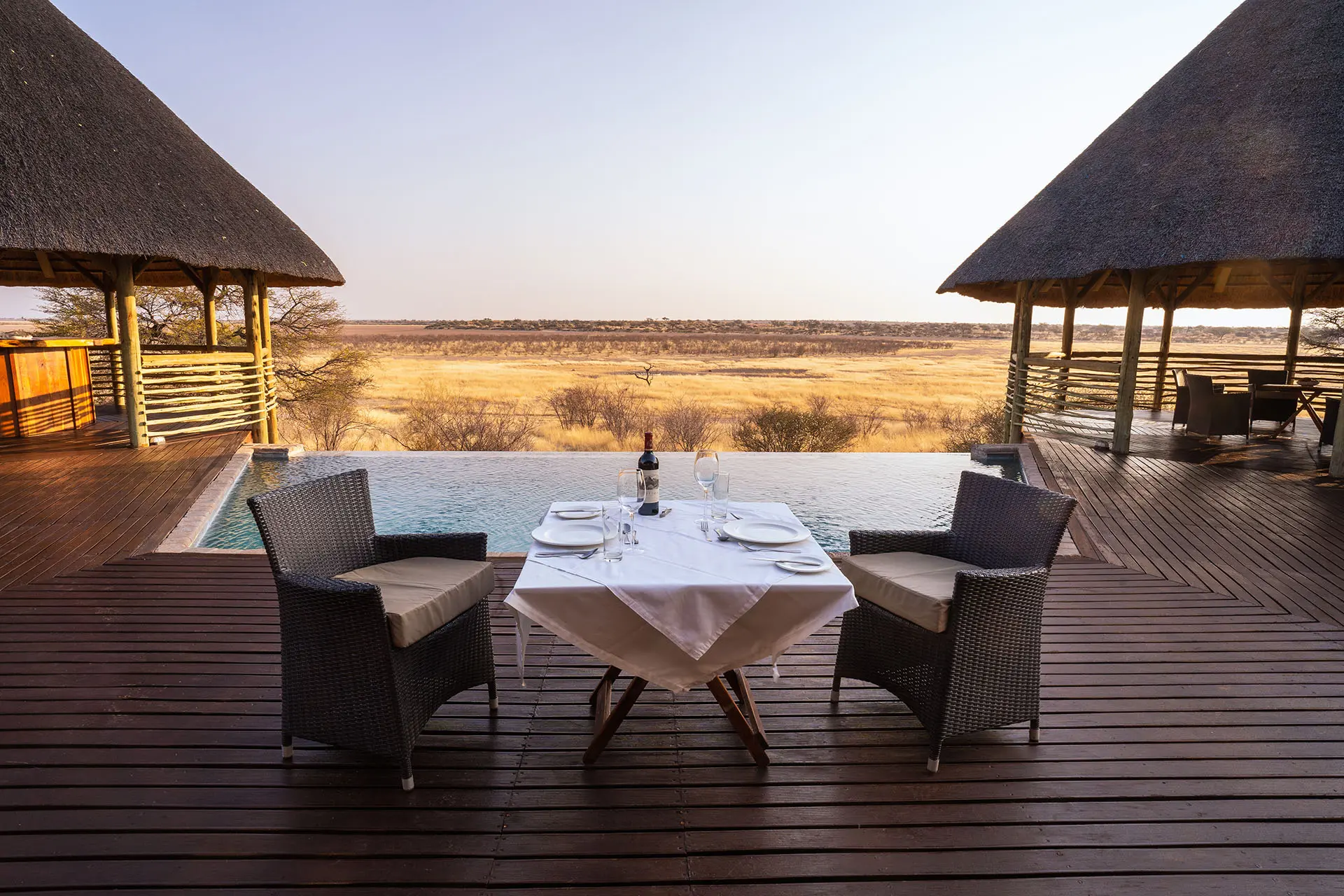 Perched high on a majestic red dune overlooking the pans of the Auob wetlands, Suricate Kalahari Tented Lodge offers the ultimate blend of wilderness and comfort. Here, you’ll fall asleep to the sounds of the Kalahari at night and wake to sweeping desert views, an unforgettable African safari experience. Our main lodge area invites guests to unwind on the deck or in the pristine infinity pool.